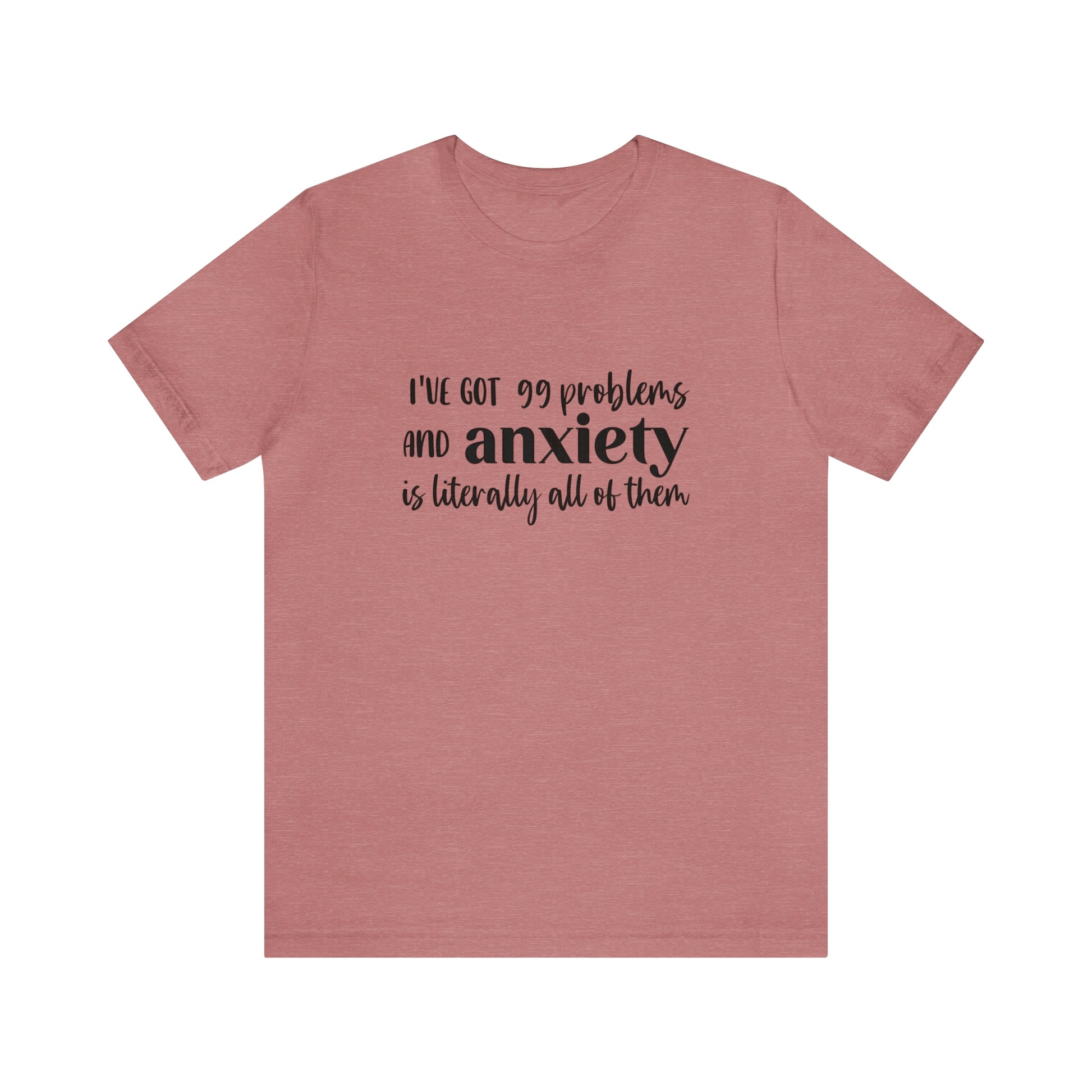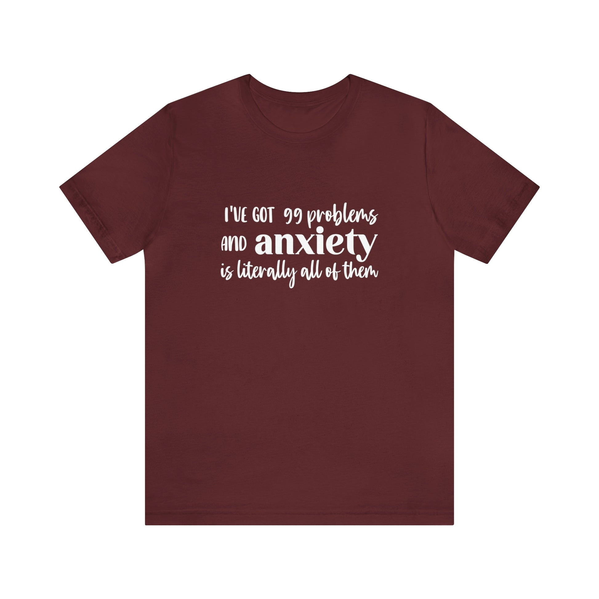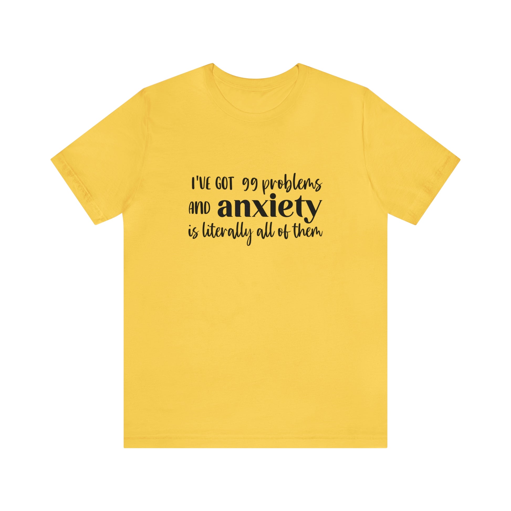 Say hello to your new favorite tee! Our Anxiety 99 problems unisex shirt is the perfect blend of comfort and style. With the quirky phrase "I've got 99 problems and ANXIETY is literally all of them" printed on the front, this tee is sure to make a statement.