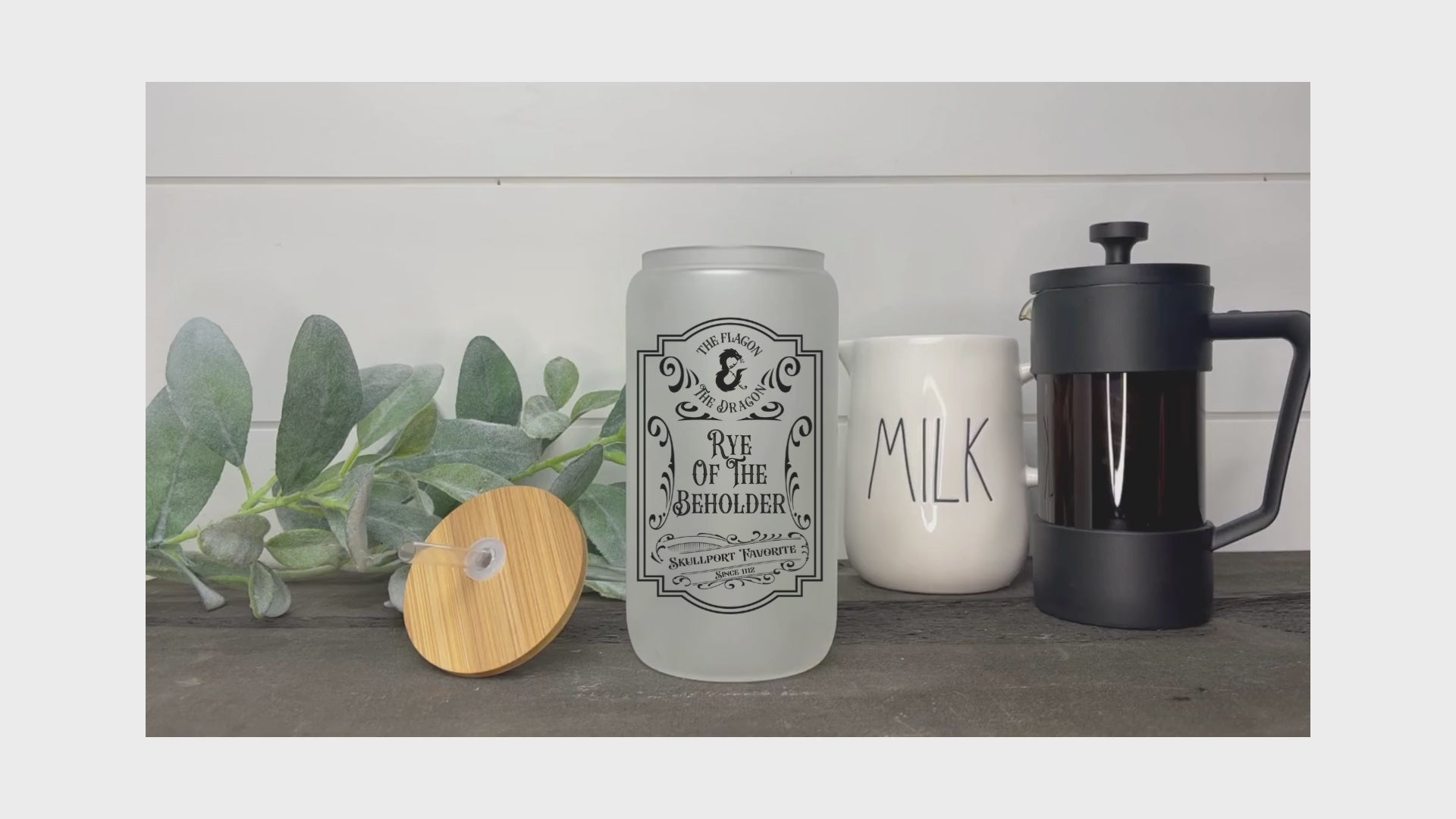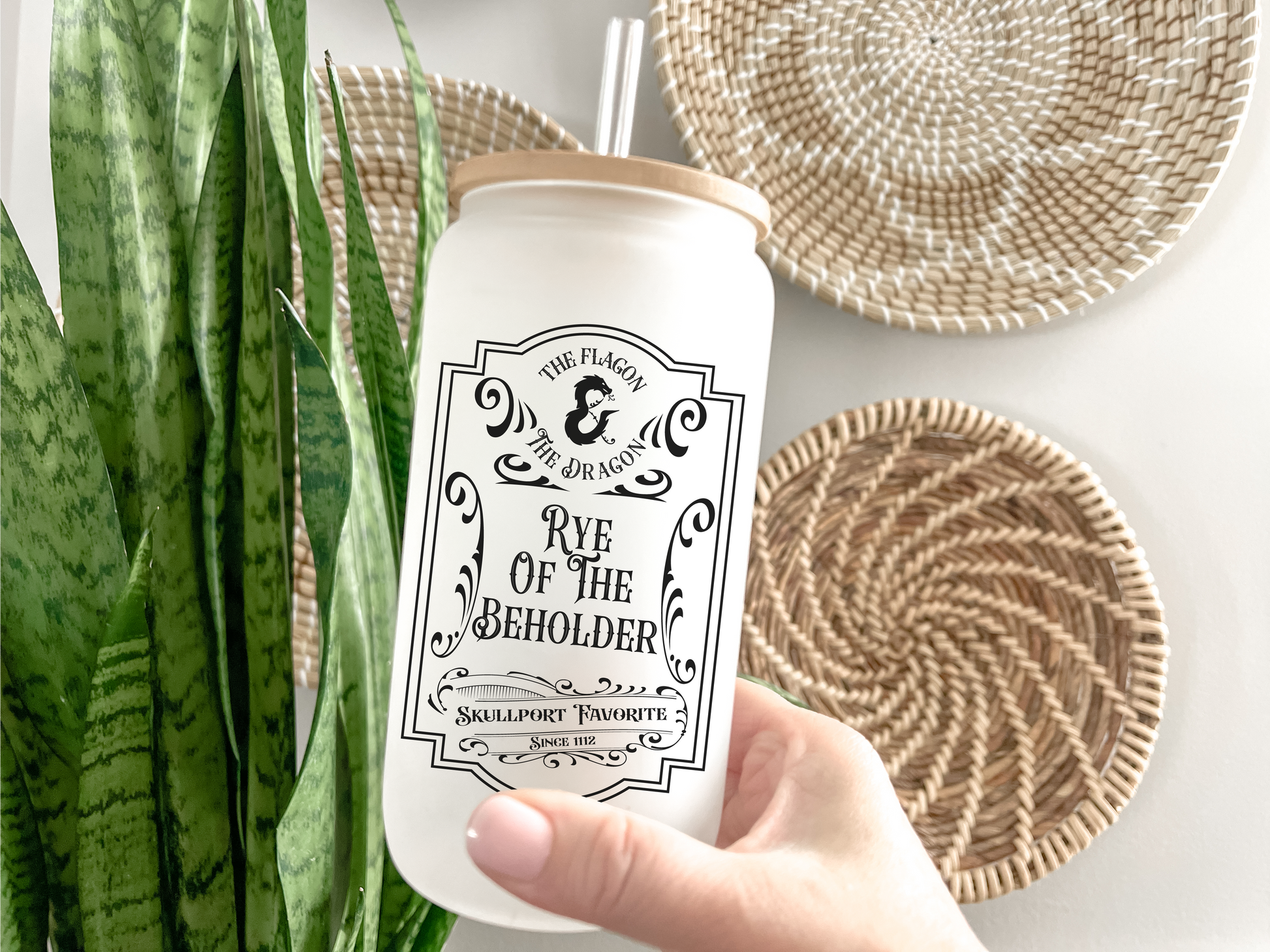 Transport yourself to the fantastical world of Dungeons and Dragons with our 18oz glass can cup featuring a vintage apothecary style label from the fictional tavern "The Flagon & The Dragon" located in Skullport.