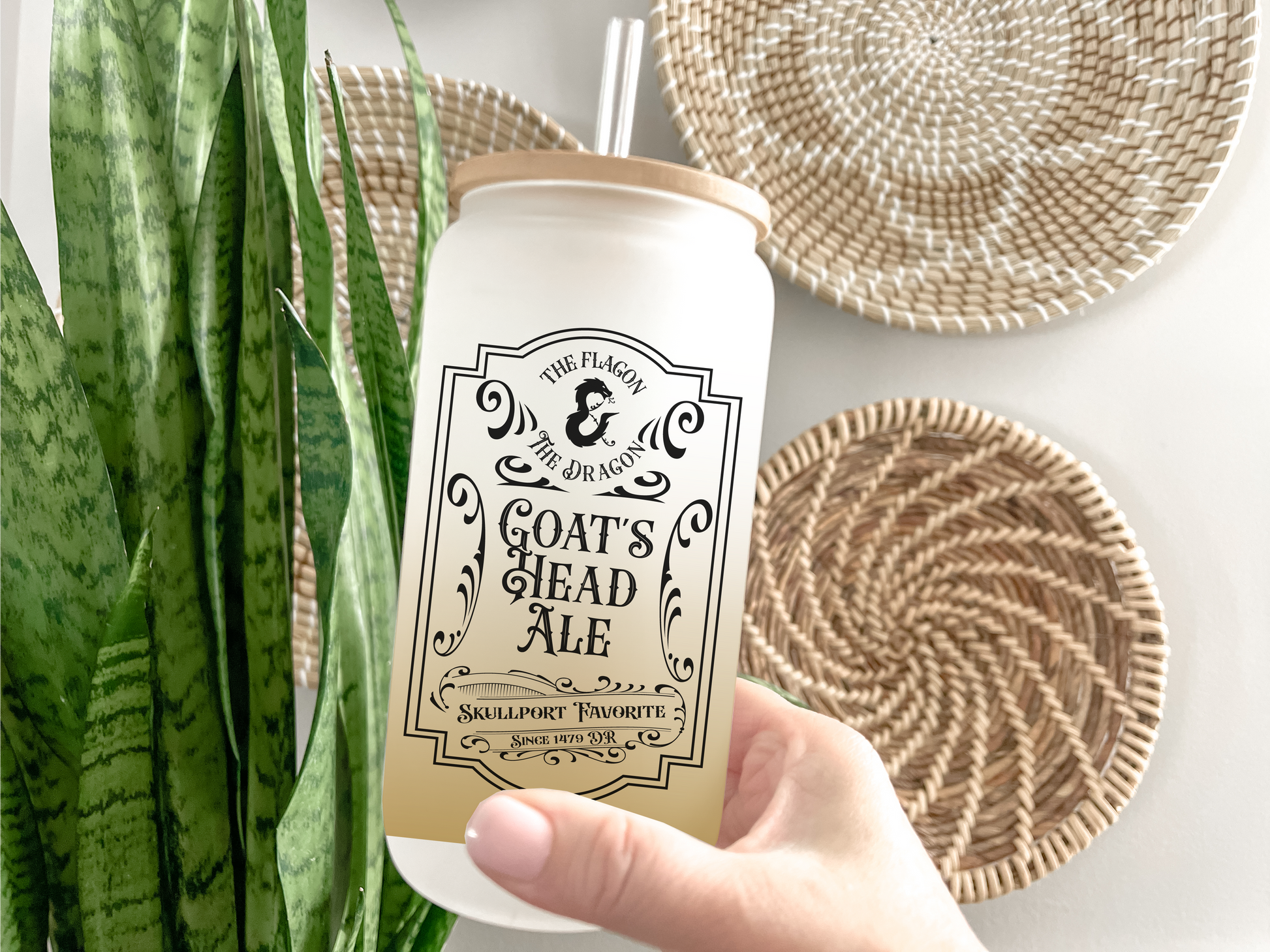 Each cup features the name of the tavern and its signature drink, all presented on a striking apothecary-style label. Whether you're a Waterdeep enthusiast or simply love D&D glassware, these 18oz frosted glass can cups are the perfect addition to your collection.