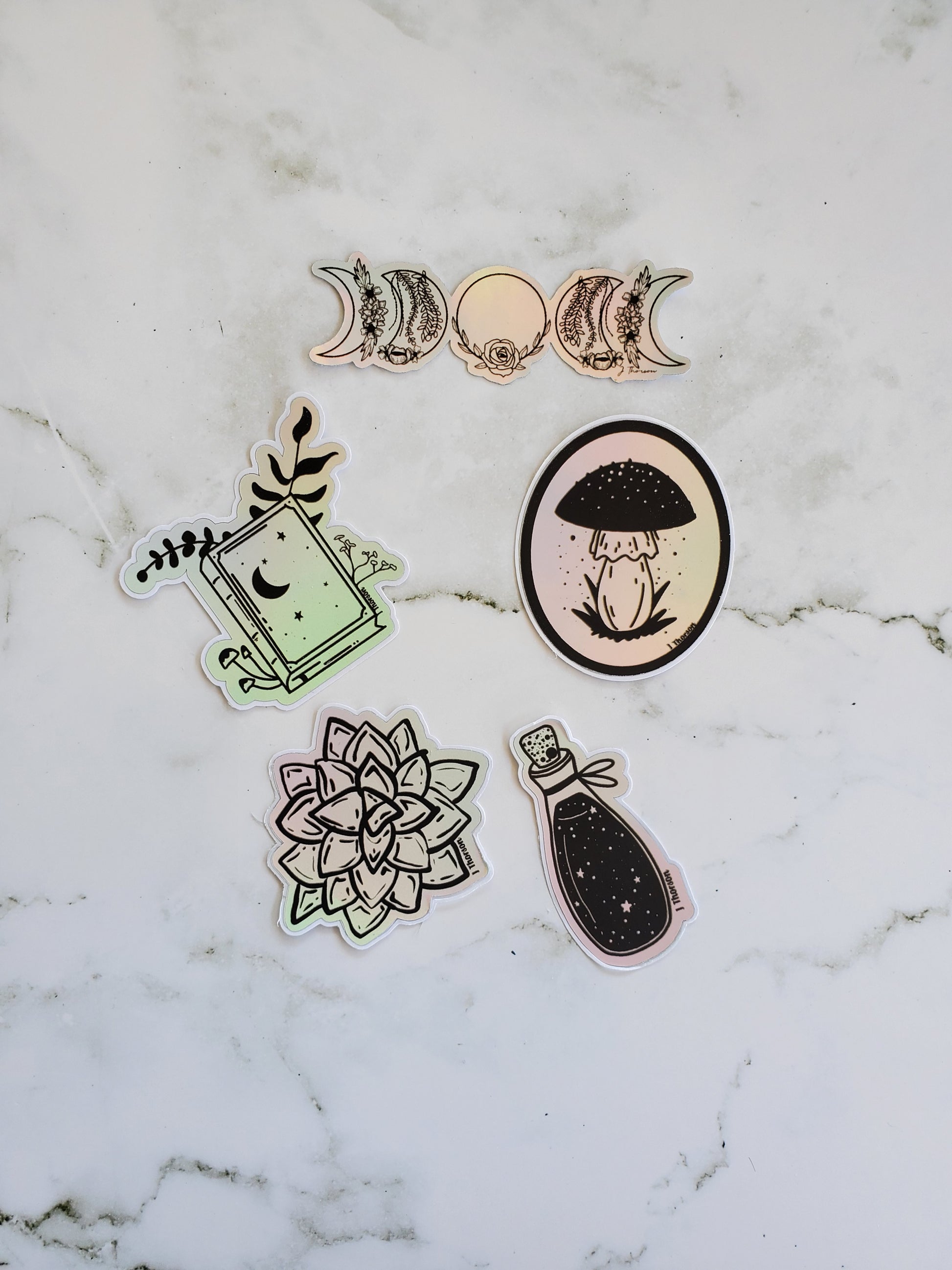 Something wicked this way comes. These dreamy holographic stickers are made in my home studio and ship out typically next business day.