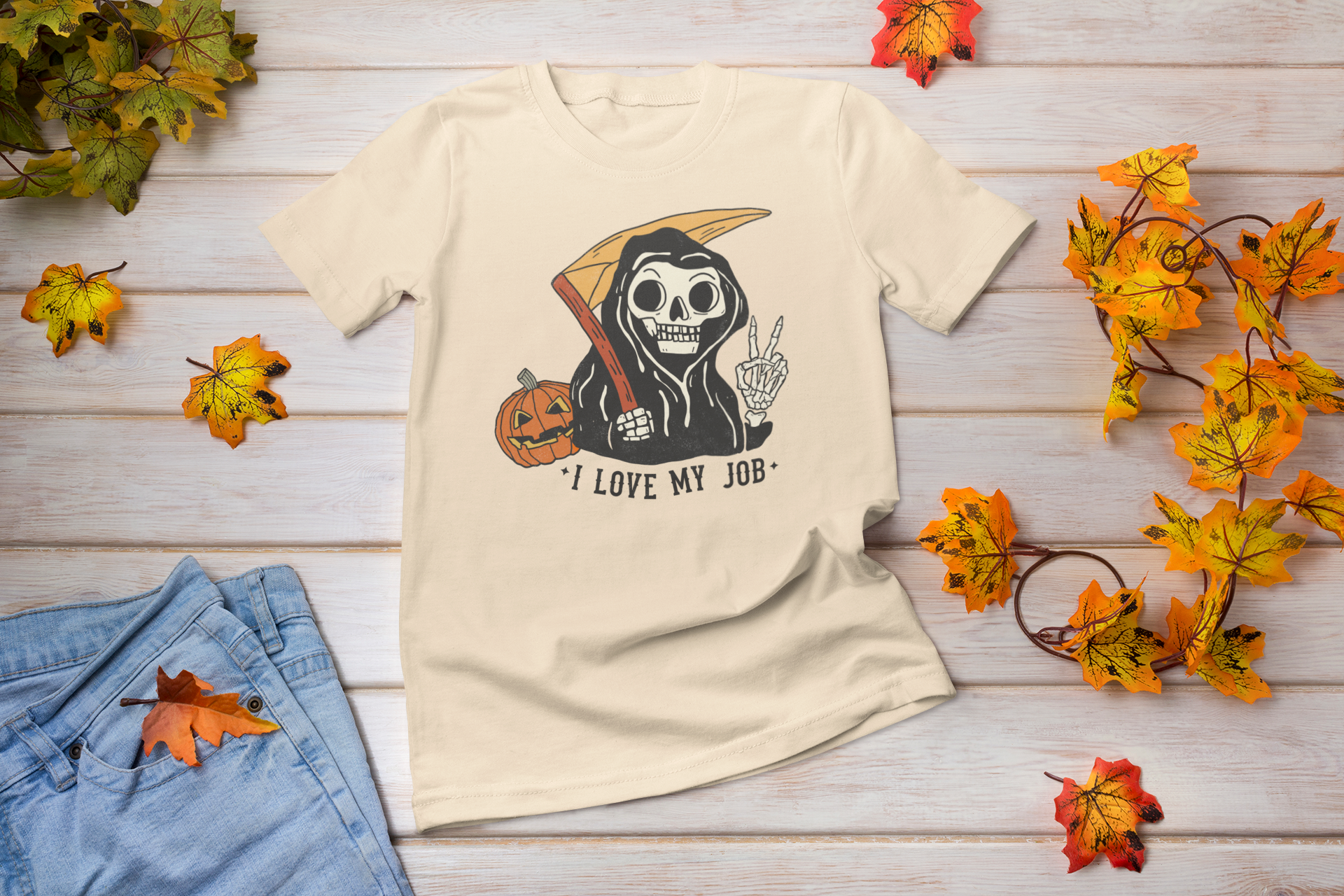 Causal grim reaper giving  a peace sign with the phrase "I love my job" below. What else do you need? It's perfect.