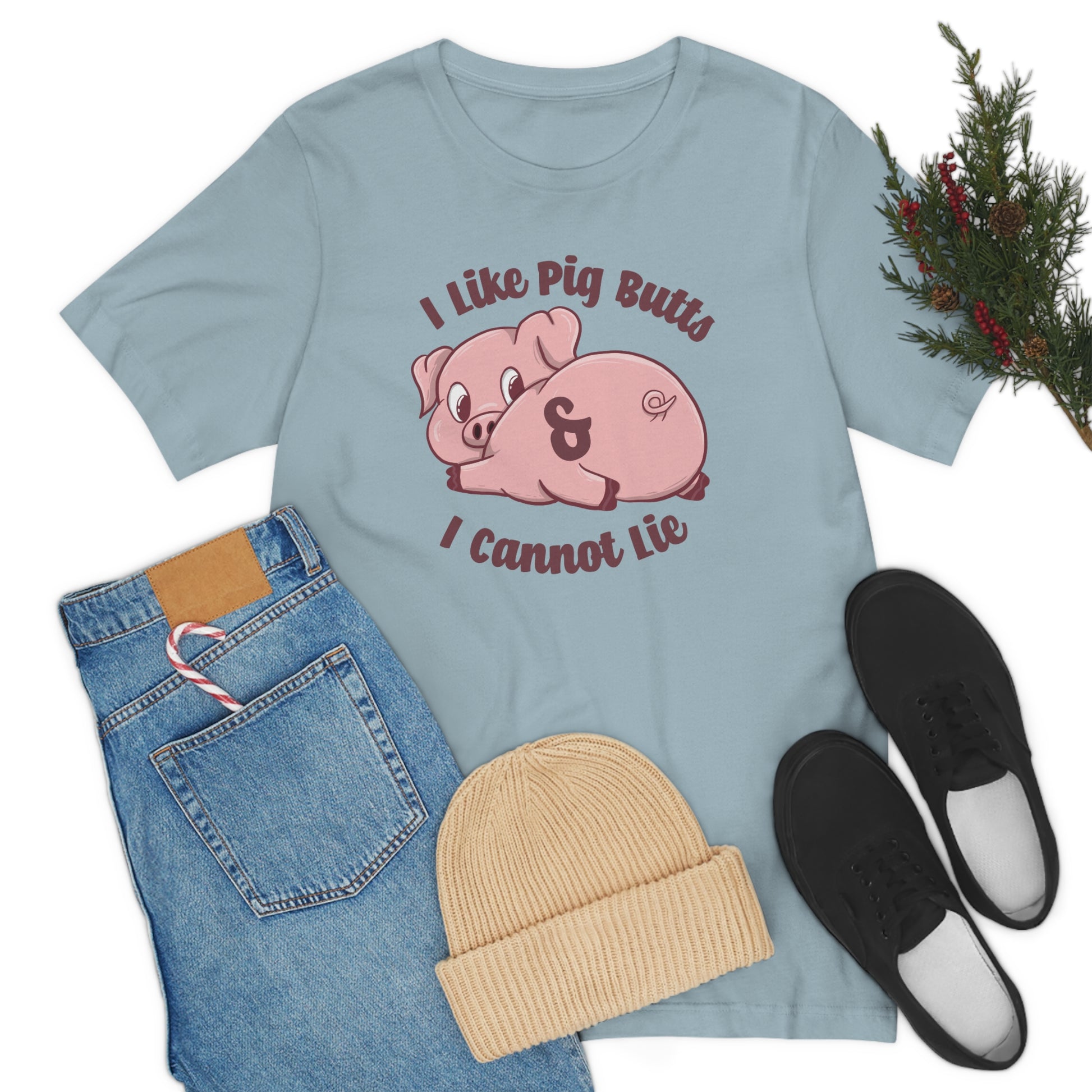 Celebrate the cuteness of our porcine friends with this adorable pig gift shirt! This whimsical design features a cartoon pig looking behind itself with the text "I like pig butts & I cannot lie". The durable fabric makes this shirt comfortable to wear all year long, and the vibrant colors ensure it will stand out in any crowd. Perfect for any pig lover, this delightful t-shirt is sure to bring a smile to everyone who sees it! It was created for my SIL who loves piggies.