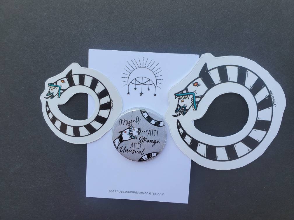 Bundle Both- 1.5 inch pin and one 2 inch sticker and one 3 inch sticker.