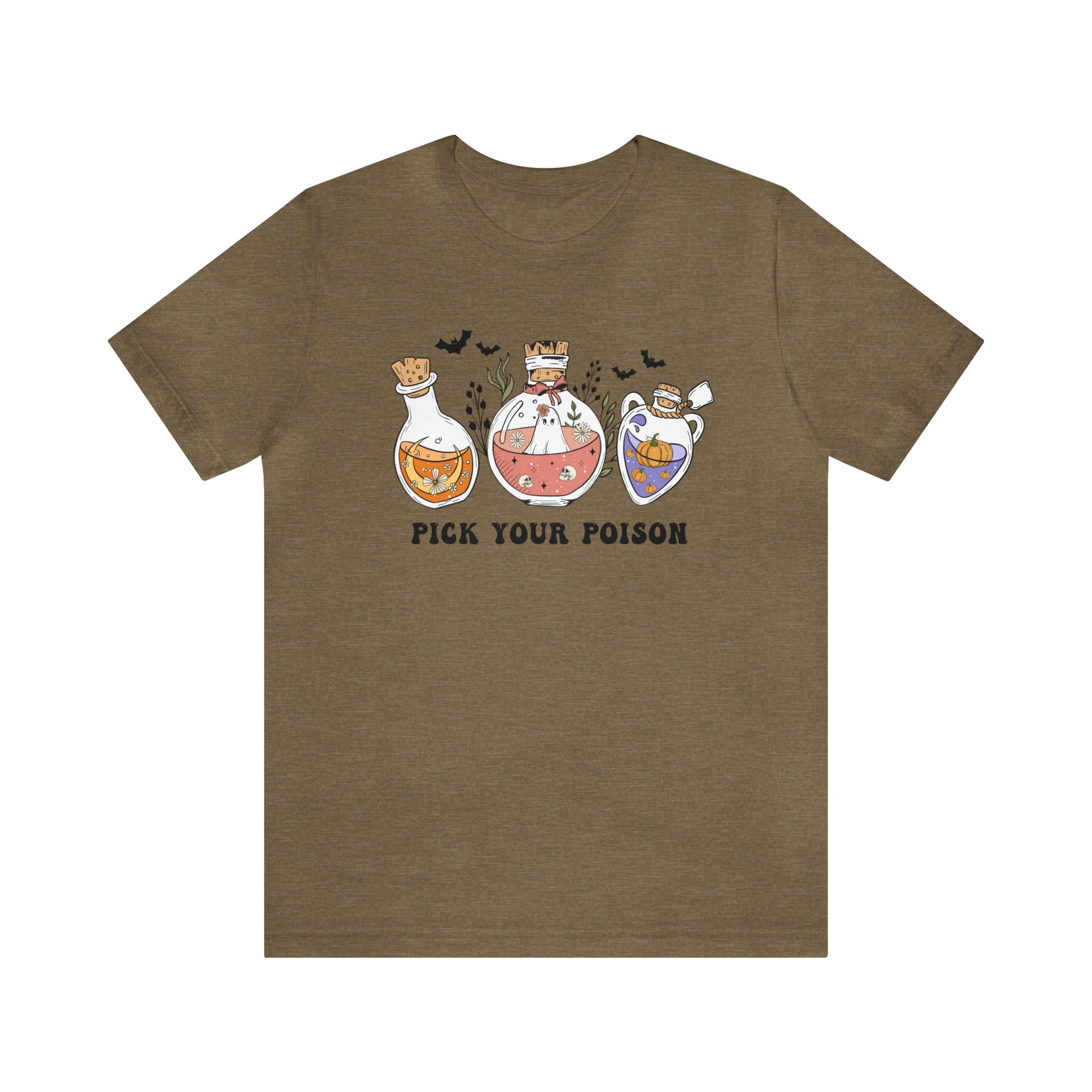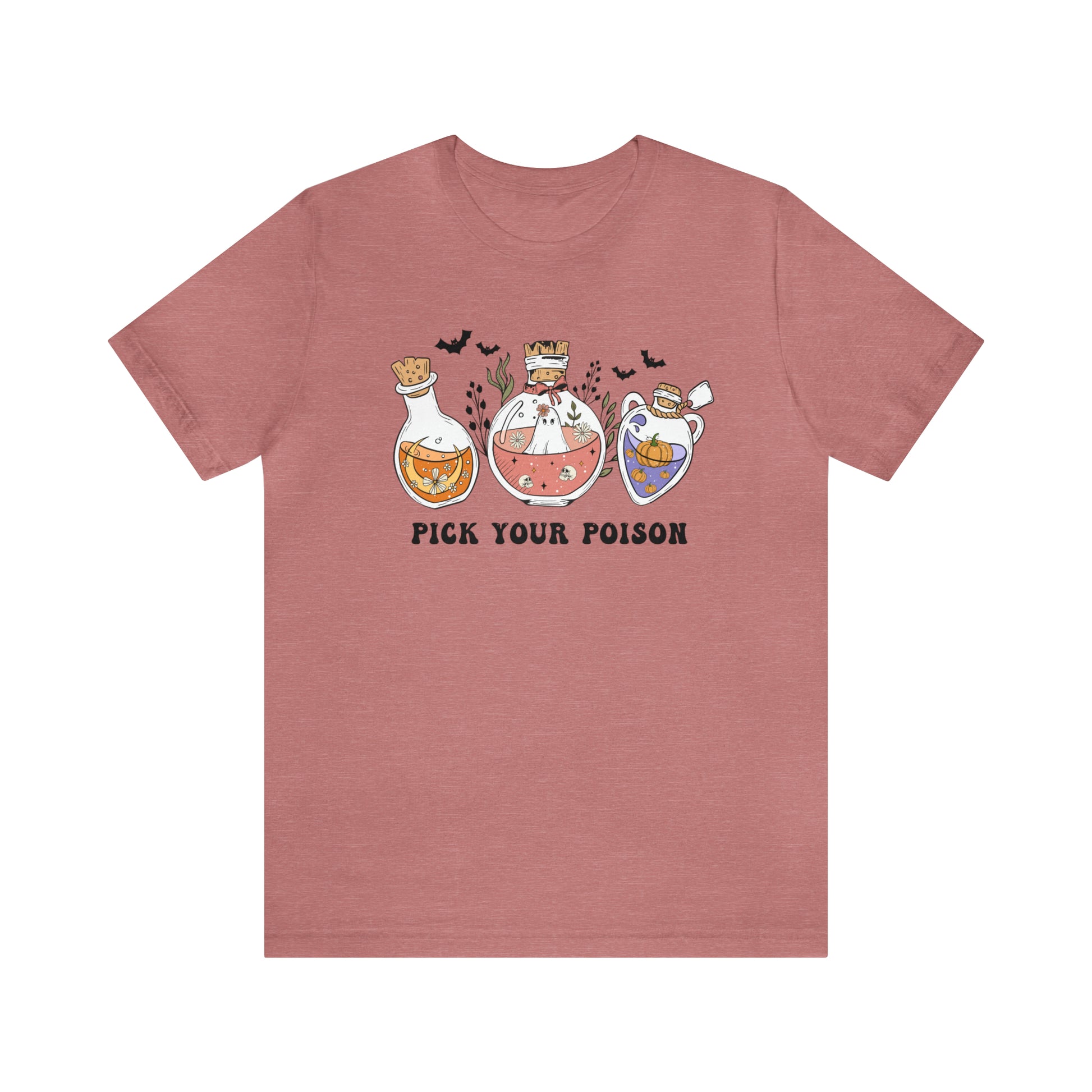 This Pick your Poison Tee is an absolute must for Halloween season! Featuring cute, spooky potion bottles with ghosts, bats, skulls, moons and pumpkins, it's a great way to express your inner whismical witch. Slip into this soft and cozy tee and you'll be ready to cast a spell of cuteness wherever you go!