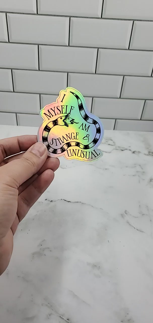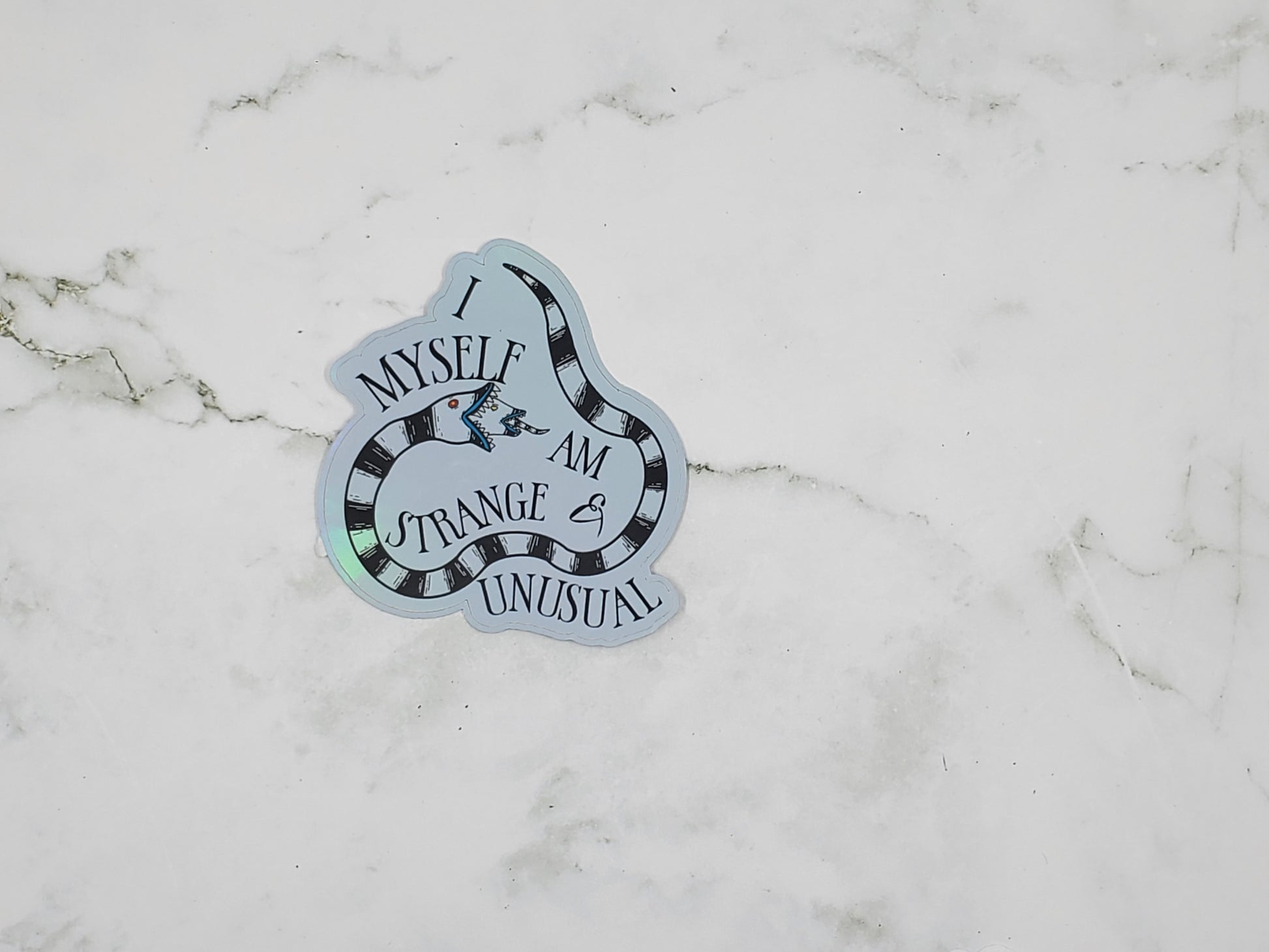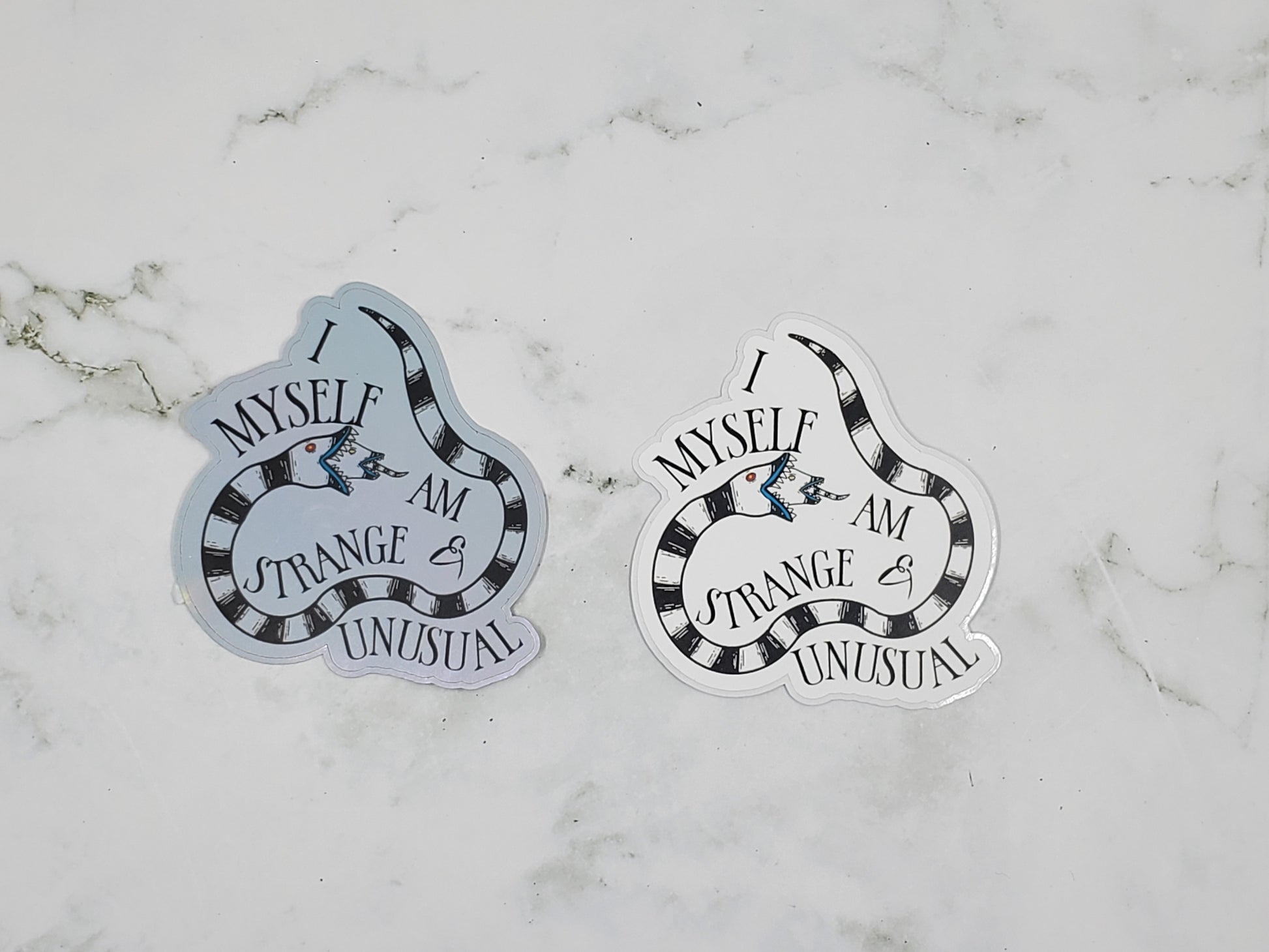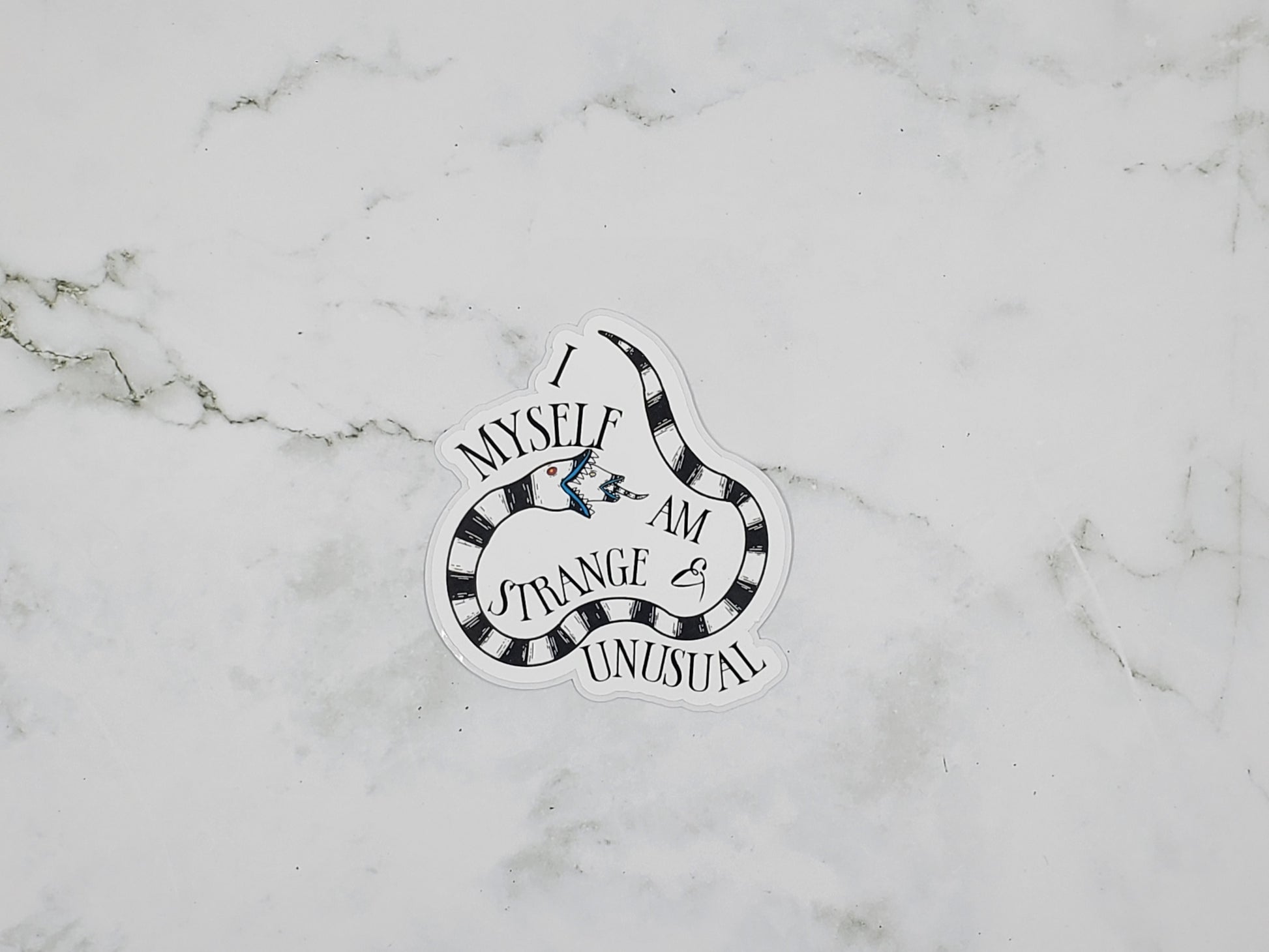 I myself am strange and unusual...a classic quote, accompanied by a classic creature. Perfect for any Beetlejuice fan! This sticker features my original art and is handmade by me. They are not licensed, this is fan art.