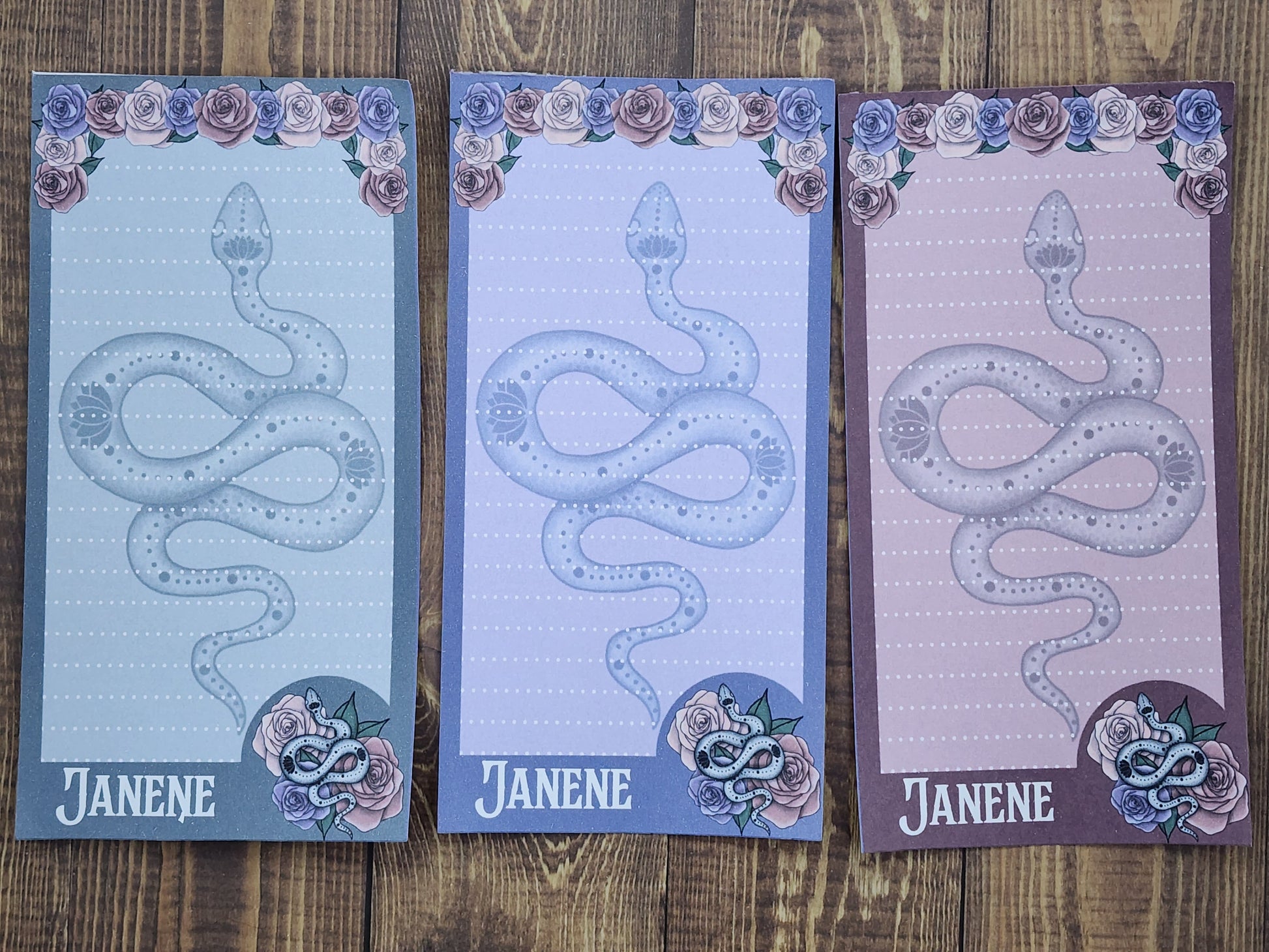 A slinky snake adorned with the representation of Hera slithers among some roses. This custom snake and rose notepad set is a unique and fun addition to any stationery collection. This eye-catching design is perfect for jotting down notes and to do lists.  The notepads are made of high-quality paper that is perfect for writing and sketching. With its beautiful design and practical use, this custom notepad set is perfect for anyone who loves snakes and roses, or for anyone looking for a one-of-a-kind stationery item.