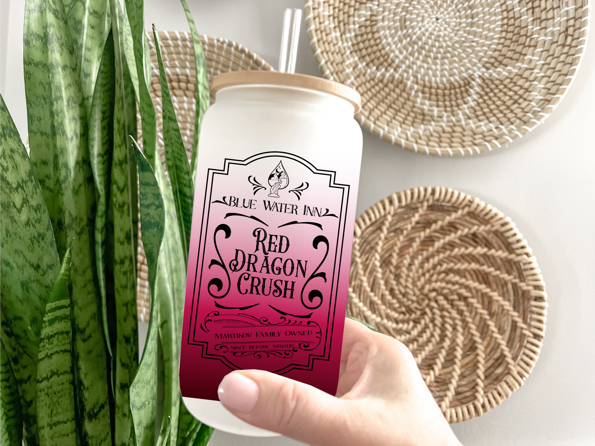 Next, visit the "Blue Water Inn," a haven for travelers seeking refuge from the harsh reality of Barovia. Enjoy the refreshing "Red Dragon Crush" in a label only or red gradient cup, while taking in the somber atmosphere of this popular destination.
