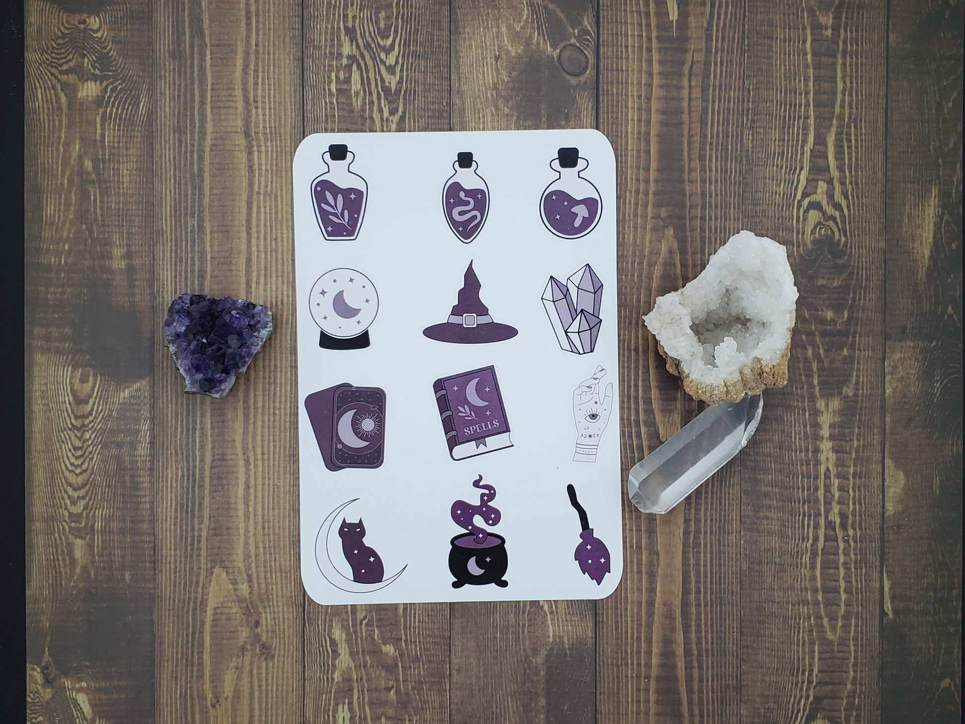 12 waterproof stickers all on one sheet. From potions to crystals there are many ways to decorate your grimoire or water bottle even.